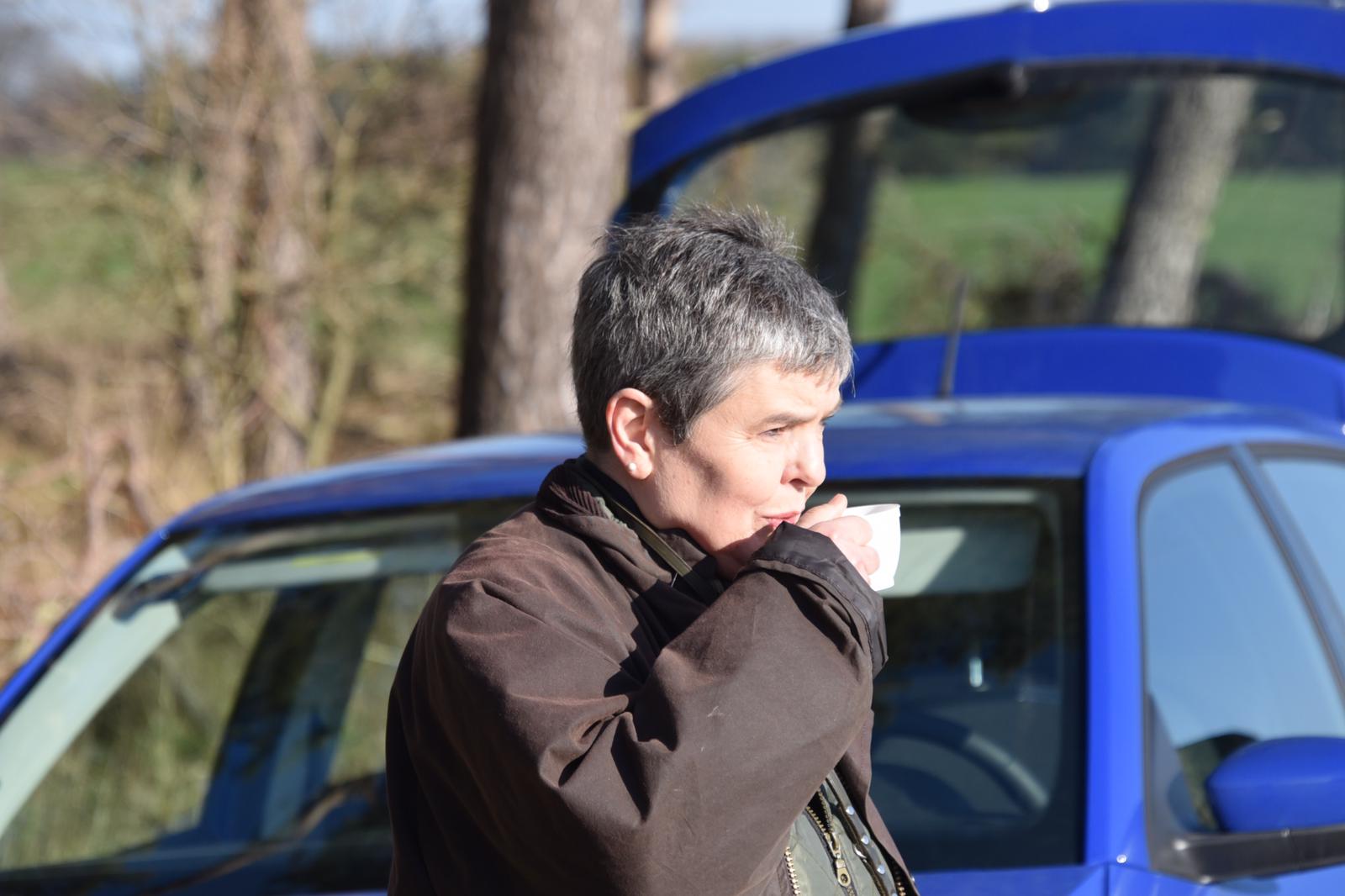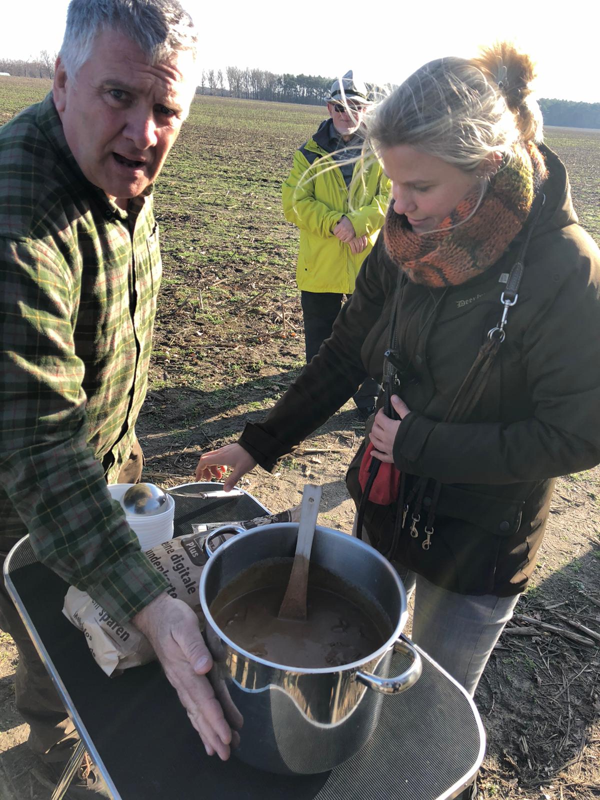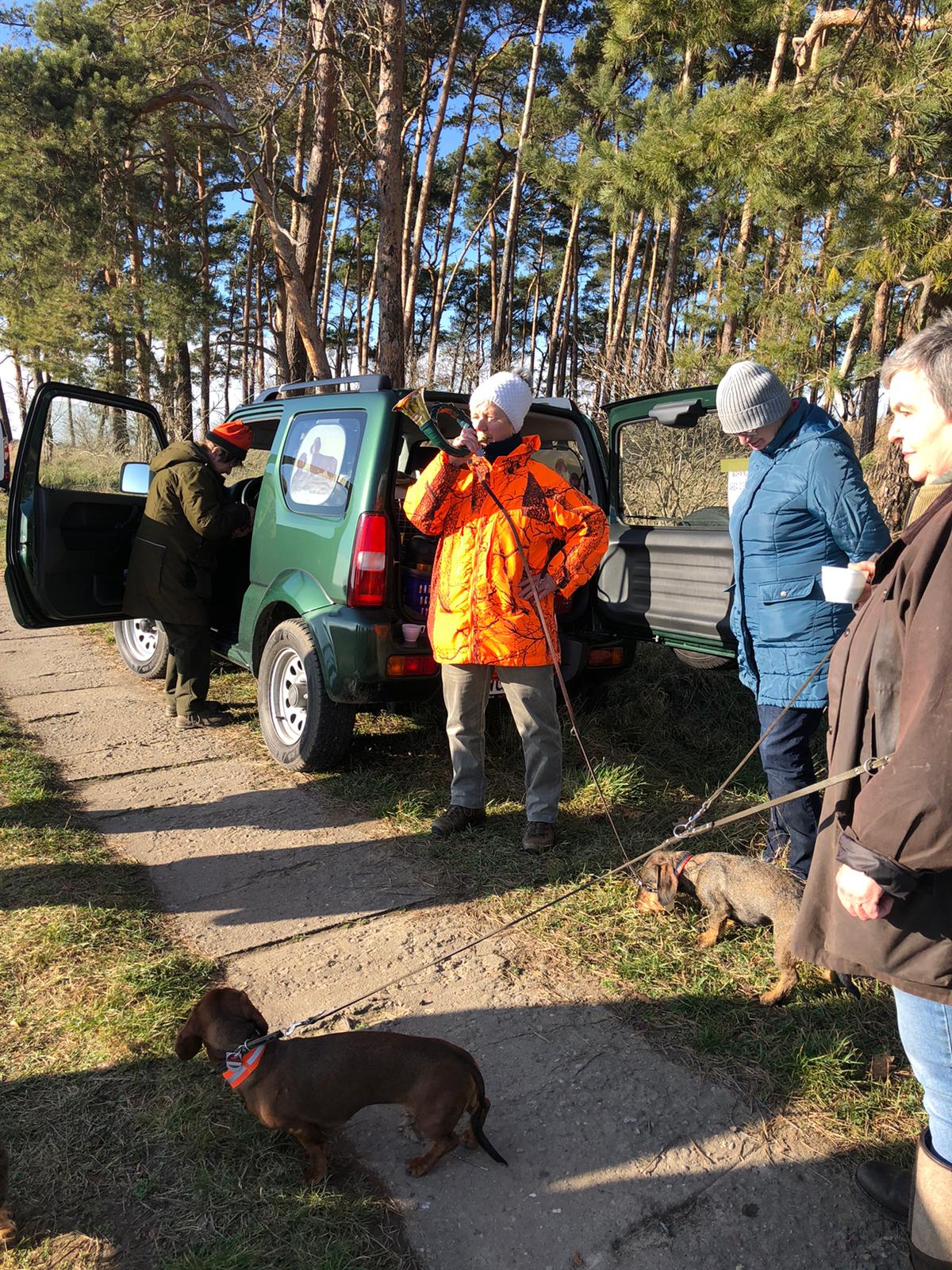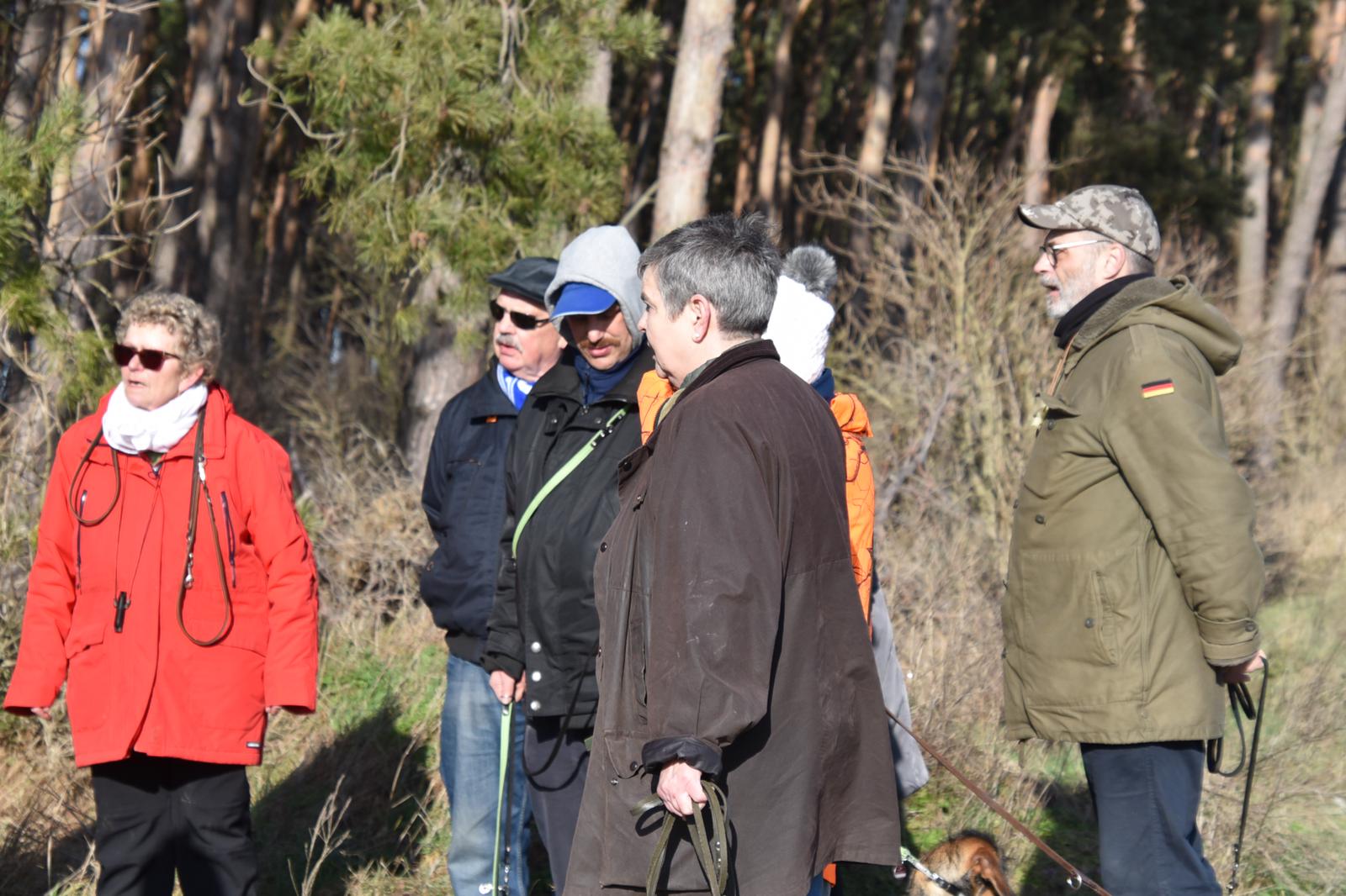 Zur Begeisterung der Hunde und natürlich auch für uns, hatten wir viel Anblick auf Rehwild. Es war frisch, aber wir hatten Sonne und die Kraniche waren zu hören. Leider jedoch fanden sich, auch wegen des trockenen Bodens, keine Wolfsspuren. Weit über eine Stunde marschierten wir über Stock und Stein. Am Ziel erwartete uns Sven Herrmann mit einem großen Topf Wildschweingulasch, Brot und Getränken. Das Wildschwein, erlegt und zubereitet von Sven, schmeckte hervorragend. Es war einfach einmal etwas was anderes draußen auch im Winter so etwas zu erleben.